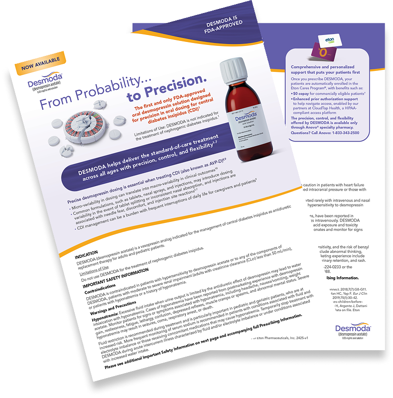 DESMODA (desmopressin acetate) is a vasopressin analog indicated for the management of central diabetes insipidus as antidiuretic replacement therapy for adults and pediatric patients.